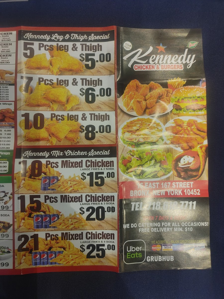 Welcome to Kennedy Fried Chicken (Halal), a charming chicken restaurant nestled in the Bronx. Renowned for its mouthwatering fried chicken, this spot blends quality service with authentic flavors. The menu boasts enticing options, from crispy chicken wings—available in various quantities—to scrumptious side orders like Bacon Cheese Fries and Sweet Potato Fries. A highlight is the delectable sweets, including a rich Tres Leche Spanish Cake and a tempting Strawberry Cheesecake, ideal for satisfying your sweet tooth.